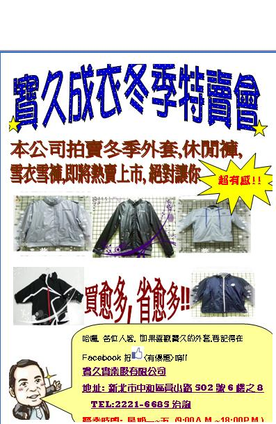 本公司拍賣冬季外套, 雪衣雪褲, 休閒褲, 褲裙, 絕對讓你溫暖100%, 請各位於2012/12/20 至寶久實業(股)公司參觀選購喔!! 如果喜歡我們的衣服, 也歡迎至facebook 按個 " 讚 " 唷!!